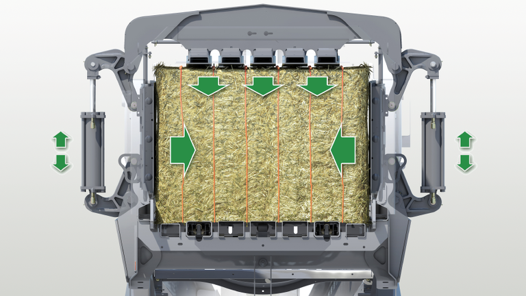Zoals altijd kan de bestuurder er in de Varioterminal voor kiezen om het menu van de pers schermvullend of gedeeltelijk weer te geven. Hier kan hij ook de gewenste waarde voor de perszuigerbelasting instellen. De machine regelt de perskamerkleppen dan automatisch. Optioneel is ook een elektrische baallengteregelaar verkrijgbaar. De bestuurder voert de gewenste baallengte in en de machine activeert als deze lengte bereikt wordt automatisch de knopers. Door de elektrische verstelling kan snel tussen verschillende baallengten worden gewisseld, wat vooral voor loonwerkers zeer interessant is. Via het bedieningspaneel kan de bestuurder bovendien ook de smeerintervallen van de knopersmering instellen, opdrachten invoeren, het aantal balen aflezen en de handmatige bediening van de perskamer inschakelen.
