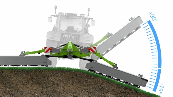 The towed mower units are suspended centrally in the centre of gravity. This ensures excellent trailing, optimal ground tracking and prevents the cutter bar getting stuck in the ground. In combination with the curved-form extension arm, the mowing units achieve a pendulum travel of +30° to -19° and effects the compensation of unevenness and height differences. The integrated compensation cylinder prevents rocking on the headland.