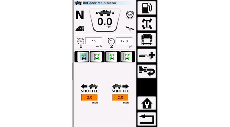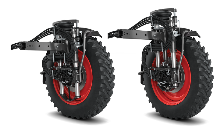 Dirección automática en las 4 ruedas: El eje trasero sigue al eje delantero cuando los giros superan los seis grados, lo que permite que el RoGator opere como una máquina estándar con tracción en 2 ruedas (2WS) en las hileras.