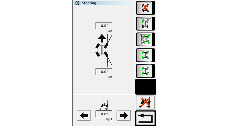 Modo “Cangrejo”: Las ruedas traseras giran en la misma dirección que las delanteras, permitiendo que la máquina se desplace lateralmente en operaciones sobre laderas, manteniendo las ruedas fuera de la hilera. También es ideal para moverse de costado y evitar obstáculos, manteniendo una cobertura precisa y uniforme.