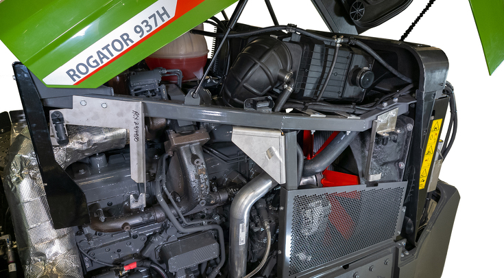 Los puntos de ajuste sencillos del sistema turbo y de los botadores hidráulicos reducen las necesidades de mantenimiento del motor para mantener al Rogator trabajando más tiempo en el lote.