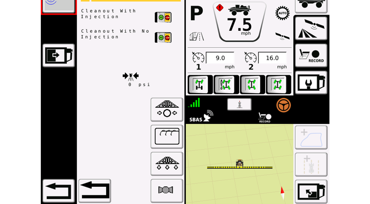 Lluvia: Si la lluvia impide la aplicación, es posible recuperar el producto químico para capturarlo y reutilizarlo. Luego, la limpieza del botalón empuja el producto remanente hacia afuera de las boquillas. El lavado del botalón puede realizarse para garantizar que las boquillas no se tapen la próxima vez que vayas a pulverizar.