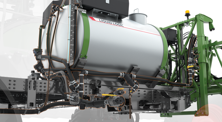Las tuberías de recirculación continua del botalón del RoGator eliminan los puntos ciegos, donde los productos químicos pueden quedar atrapados, y la necesidad de quitar las tapas. Un estudio reciente de la Universidad de Purdue determinó que las tuberías de recirculación del botalón FlowLogic™ pueden lavarse para eliminar eficazmente los contaminantes hidrosolubles en un 99,6 % o más, con un triple enjuague, utilizando el procedimiento recomendado por Fendt RoGator.