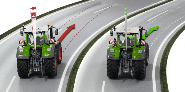 El sistema de estabilidad Fendt Stability Control (FSC) es un innovador sistema dependiente de la velocidad que se activa automáticamente para garantizar la estabilidad lateral del tractor. Este sistema integrado estabiliza el tractor amortiguando la inclinación lateral, lo que se traduce en una notable precisión de dirección, estabilidad de conducción y seguridad de frenado en todas las aplicaciones. Cuando la velocidad es mayor a 20 km/h, el FSC bloquea la compensación entre el lado derecho y el izquierdo de la suspensión del eje delantero. Esto garantiza una precisión de dirección y una estabilidad de conducción aún mayores, lo cual es especialmente ventajoso en trayectos rápidos y condiciones exigentes. Con el sistema FSC, los conductores pueden estar seguros de que su tractor estará siempre óptimamente estabilizado, sin importar los desafíos que enfrenten.