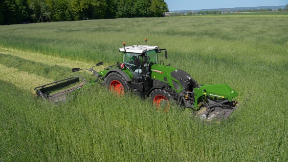 "Wir haben eine Saison lang mit der Slicer-Kombination gearbeitet. Zwischen gespannt waren zu Anfang der Saison ein Fendt 936 Vario und später ein 728 Vario. Der schwere, große 936 war im ersten Schnitt optimal, und im Grünroggen gab es ausreichend Leistungsreserven. Bei den späteren Schnitten war der 728 passend. Er bildete mit den Mähwerken ein sehr wendiges Gespann, welches mit den umfangreichen Automatikfunktionen fast einem Selbstfahrer nahekam. Das Schnittbild und die Aufbereitung waren dabei immer top."