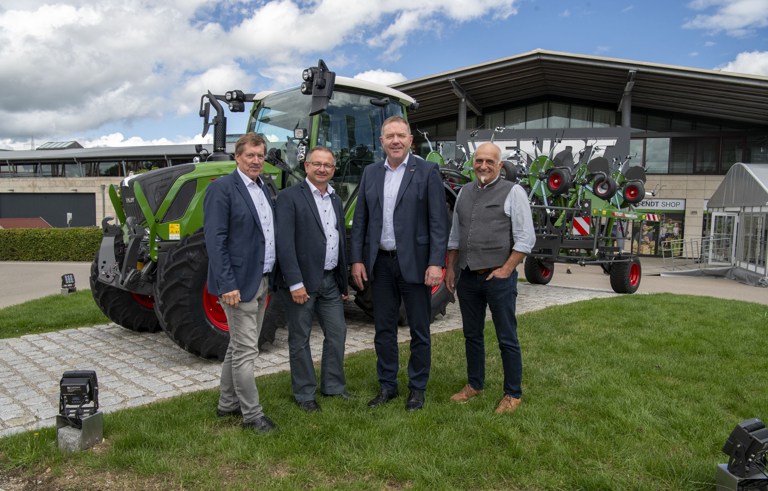 Thomas Knecht (1.Vorsitzender Red Farmer e.V.) mit Christoph Gröblinghoff (Vice President und Vorsitzender der Fendt Geschäftsführung) vor einem grünen Fendt Traktor