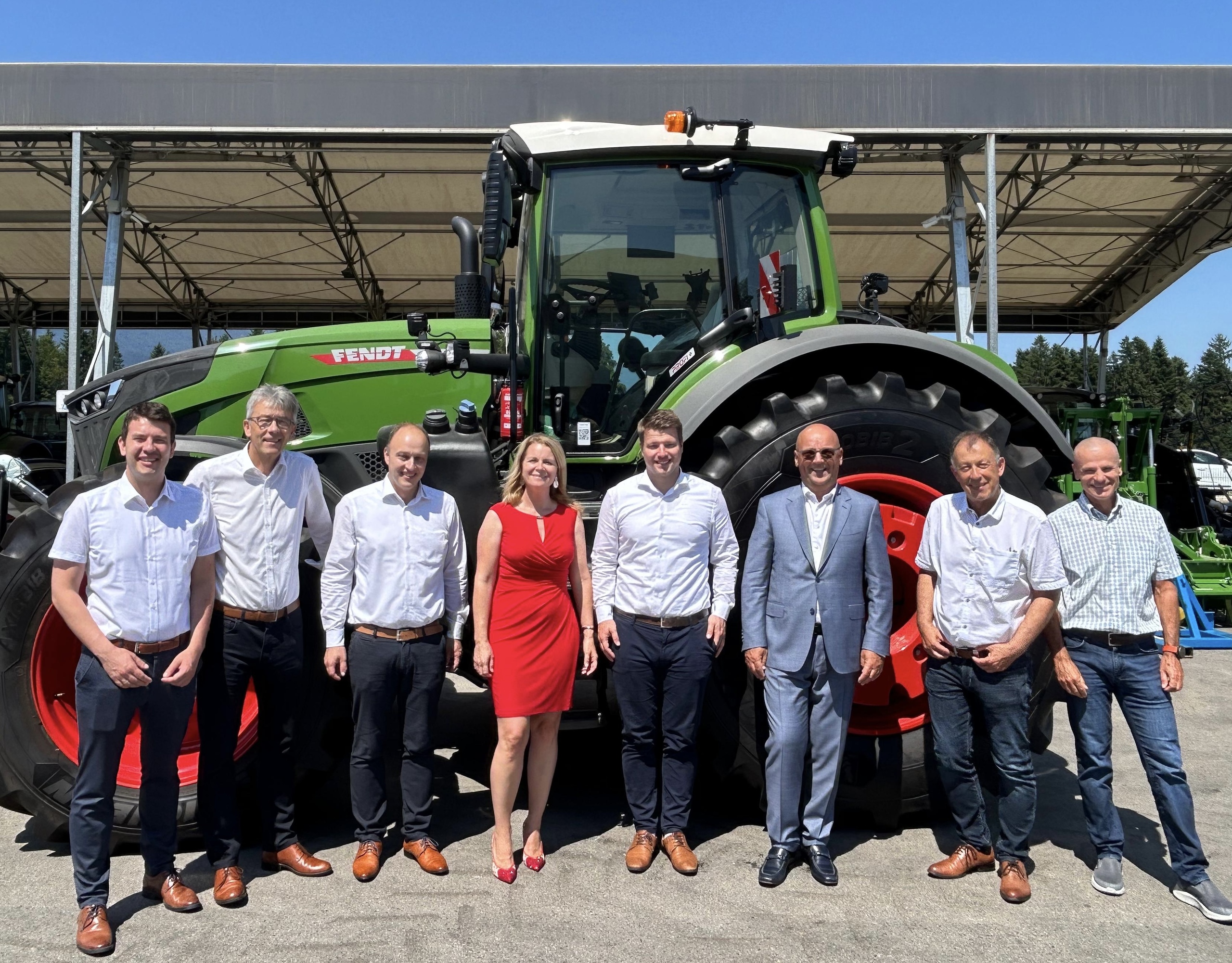 Gruppenfoto von 8 Personen, davon 7 Männer in der Mitte eine Frau vor einem grünen Fendt Traktor