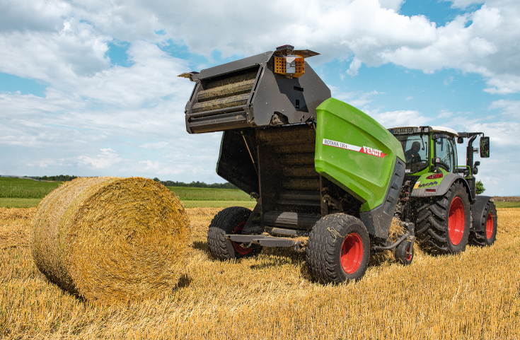 Die Heckklappe der Presskammer wird über zwei stabile Zylinder auf und zu geschwenkt. Dafür brauchen Sie nur ein einfach wirkendes Steuergerät. Das alles sorgt für schnelle Auswurfzeiten und mit einem Fendt Vario Traktor beschleunigen Sie binnen Sekunden sanft und stufenlos auf Arbeitsgeschwindigkeit. Das macht Fendt Traktoren und Rundballenpressen zum perfekten Gespann.