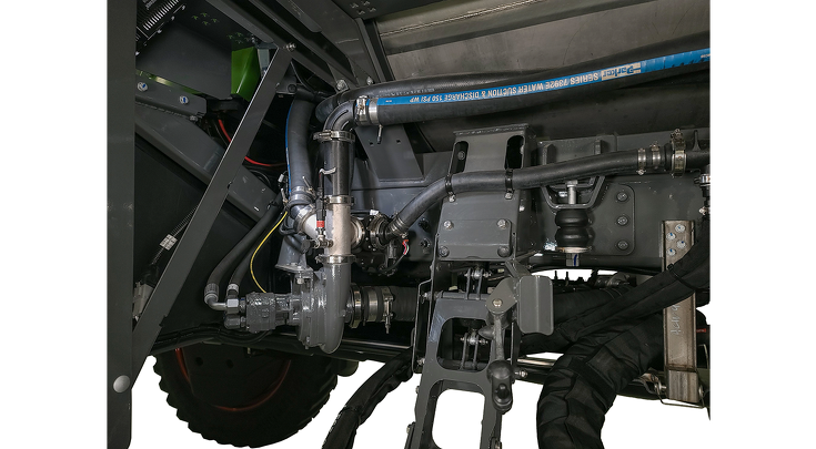 O sistema utiliza uma bomba dupla de alto volume (5-200 onças por bomba mínima) com tanques duplos de 40 galões montados em lados opostos para manter a máquina baçanceada.