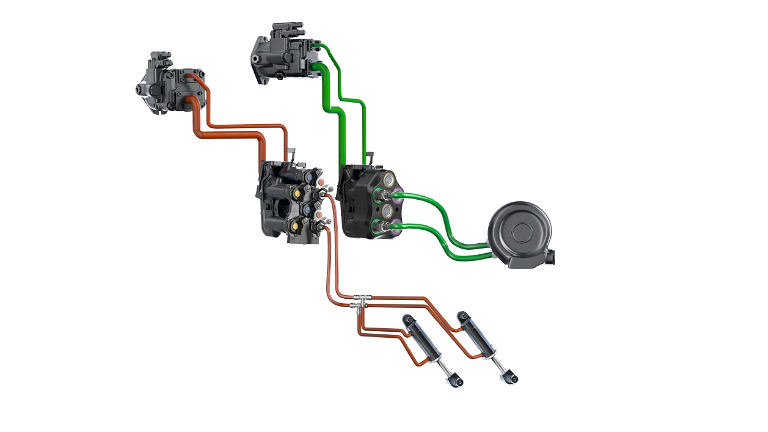 Duas bombas hidráulicas com um caudal de 430 l/min: possibilidade de alimentação de dois consumidores com diferentes pressões e caudais de óleo.