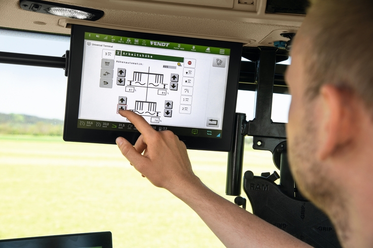 Com a ajuda do ISOBUS, o operador ajusta a largura de trabalho e da leira diretamente da cabine do trator. A largura da leiraé sempre ajustada de forma síncrona através dos rotores traseiros, enquanto a largura de trabalho pode ser ajustada tanto de forma síncrona quanto independente para o lado esquerdo e direito através dos rotores dianteiros. Isso traz benefícios no caso de obstáculos de um dos lados, como árvores.