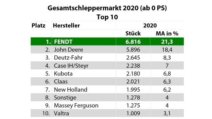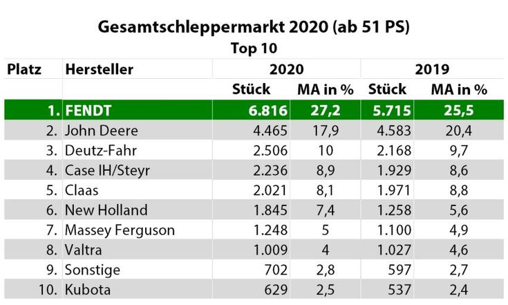 Einen neuen Bestwert erreichte Fendt in der Leistungsklasse ab 51 PS. Hier erlangte die Marke einen Marktanteil von 27,2 Prozent und verbesserte sich damit um 1,7 Prozentpunkte gegenüber dem Vorjahreswert von 25,5 Prozent. Der Abstand zum Zweitplatzierten vergrößerte sich um 9,3 Prozentpunkte weiter.
