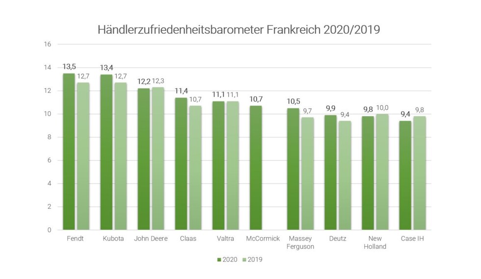 Zeitgleich mit den Marktanteilen wurden auch die Daten aus dem französischen Händlerzufriedenheitsbarometer 2020 für Frankreich veröffentlicht. In diesem Jahr wurde Fendt erneut auf den ersten Platz gewählt. Mit insgesamt 13,5 Punkten liegt Fendt damit 0,8 Punkte vor dem Zweitplatzierten und hat sich auch um 0,8 Punkte gegenüber dem Vorjahr verbessert. In der Umfrage bewerteten die französischen Händler die Traktorhersteller in insgesamt 14 Kategorien und konnten bis zu 20 Punkte vergeben.