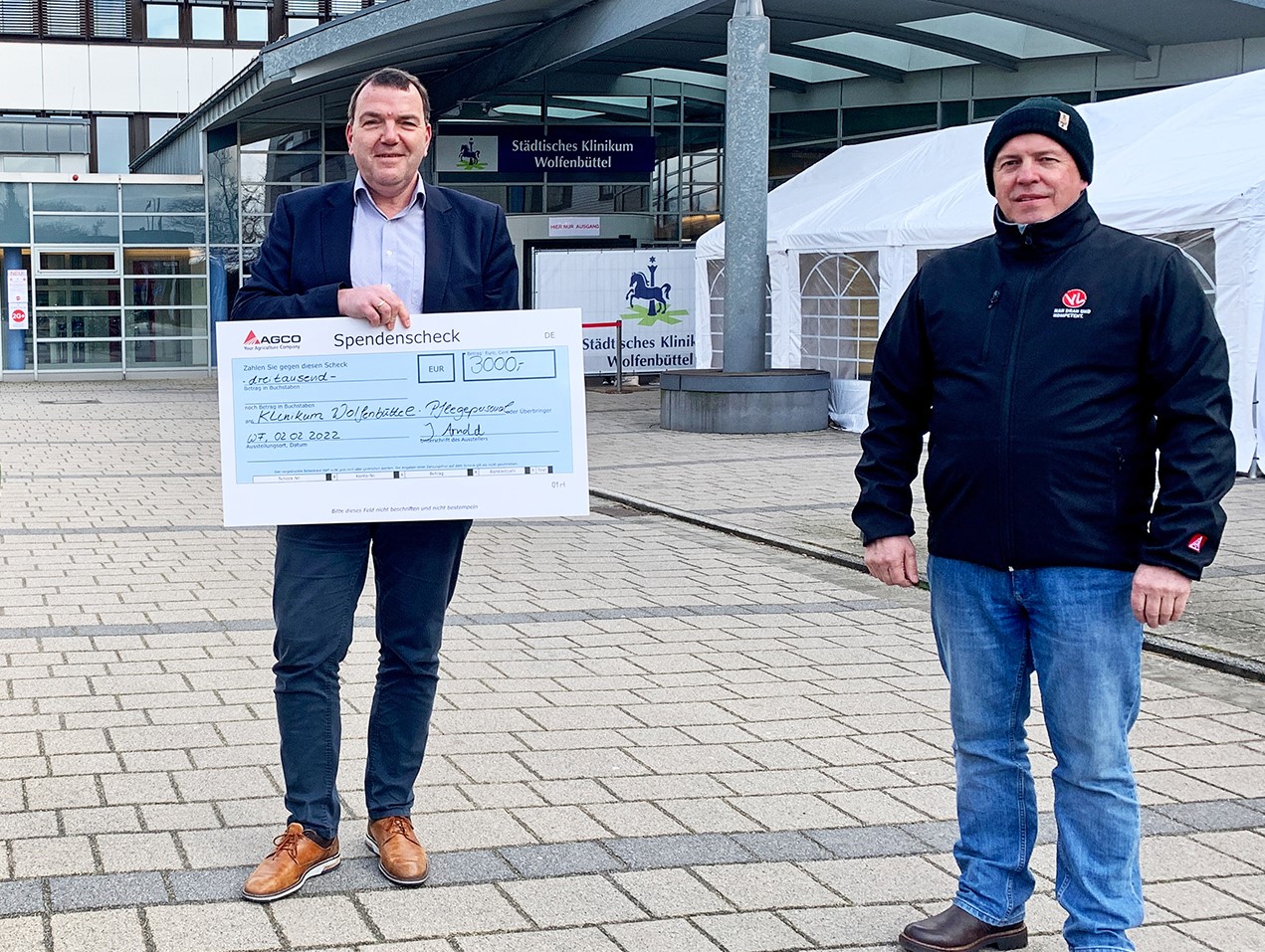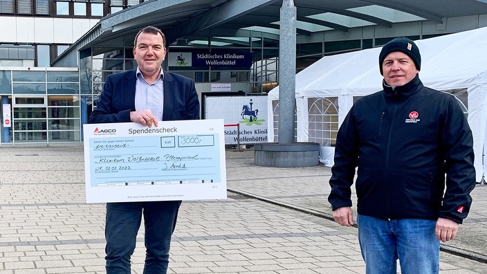 Bisher fertigten die Mitarbeitenden am Standort Wolfenbüttel (Niedersachsen) ausschließlich Rundballenpressen. Ab September wird am Standort auch der Ladewagen Fendt Tigo gefertigt. Die Umbau- und Modernisierungsmaßnahmen für die neue Produktion laufen bereits und fördern immer wieder veraltete Werkzeuge, Möbel oder auch Schüttgut zu Tage. Diese Gegenstände können Mitarbeitende gegen eine Spende erwerben, die dann an einen guten Zweck geht. Gleich 3.000 Euro sind durch die Aufräumarbeiten zusammengekommen. Die Spendensumme wurde nun durch Michael Ziehe, Vorsitzender des Betriebsrates AGCO GmbH Wolfenbüttel, an das örtliche Klinikum übergeben.