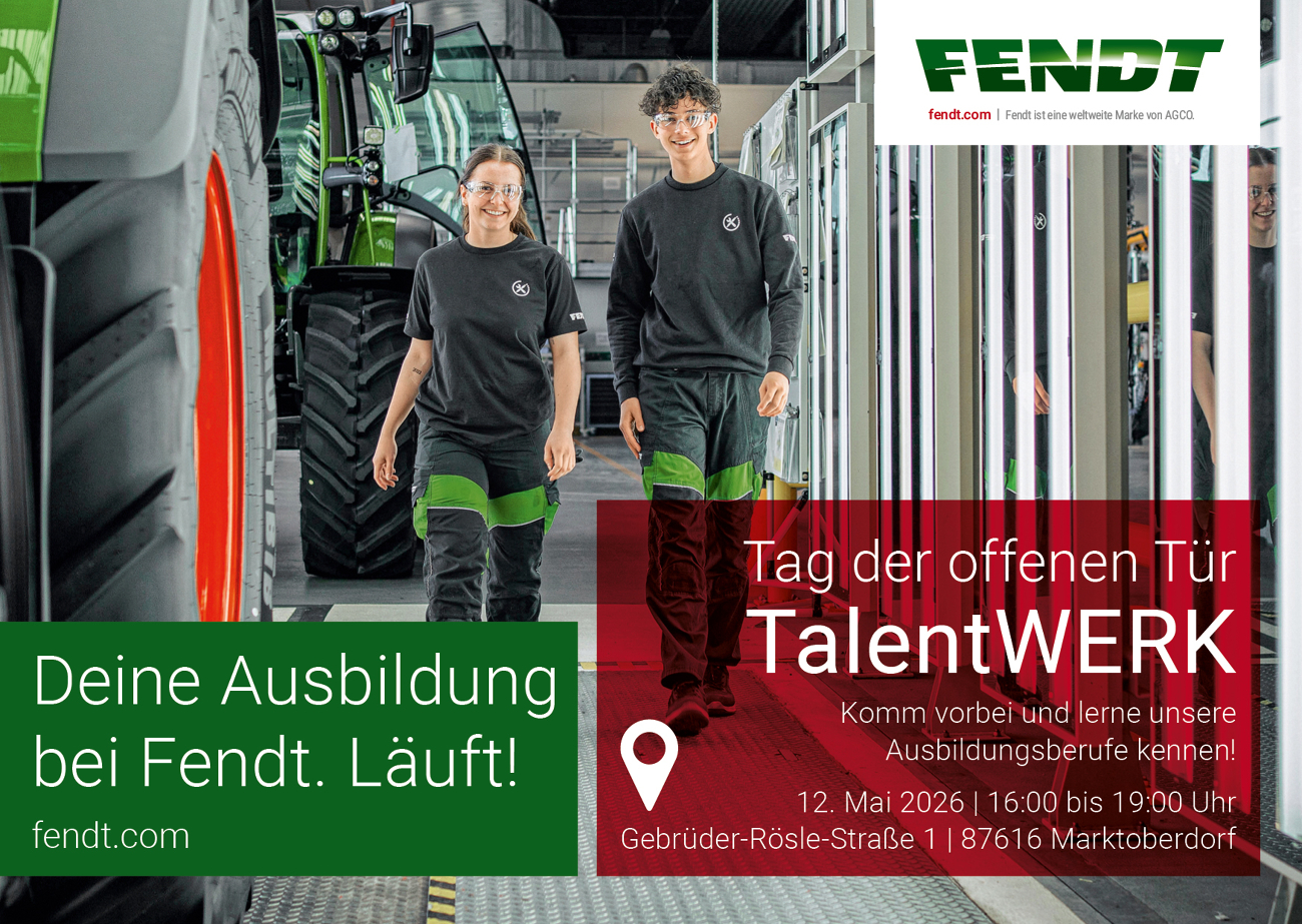 | Tag der offenen Tür | TalentWERK | 12.05.2026 | 16:00 - 19:00 Uhr | Fendt TalentWERK Gebrüder-Rösle-Straße 1 87616 Marktoberdorf |