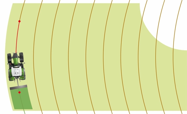 Der Spurführungstyp Kurve führt Maschinen entlang gekrümmter Linien. Diese Methode ist besonders nützlich auf Feldern mit kurvenförmigen Feldgrenzen. Durch die präzise Steuerung entlang der Kurven wird die Effizienz der Feldbearbeitung erhöht und die Bodenverdichtung minimiert.