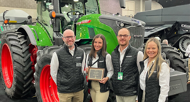 (de izq. a dcha.) Benjamin Matthies (director de marketing de Fendt Norteamérica (NA)), Cornelia Riederer (especialista de productos de marketing de Fendt NA), Brandom Montgomery (director de marketing estratégico de Fendt NA) y Cris Masina (directora de marketing de Fendt NA) están encantados con el premio recibido por el joystick de dirección ErgoSteer.
