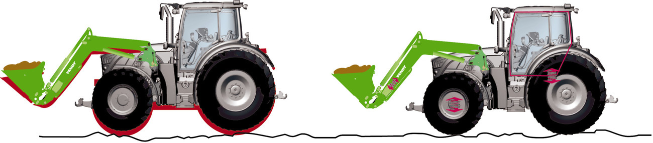 El sistema de amortiguación, que se encuentra totalmente protegido en la viga transversal, ofrece una comodidad excepcional. Los acumuladores de nitrógeno del cargador frontal actúan como amortiguadores de golpes u oscilaciones. Las oscilaciones hacen que el aceite hidráulico se empuje contra una membrana en los acumuladores. Esto comprime el volumen de gas, lo que reduce de forma fiable los picos de carga. Si se necesita un control preciso del apero, el sistema puede desconectarse eléctricamente con un pulsador rápido que se encuentra situado en la cabina (mecánico para el brazo 3X).