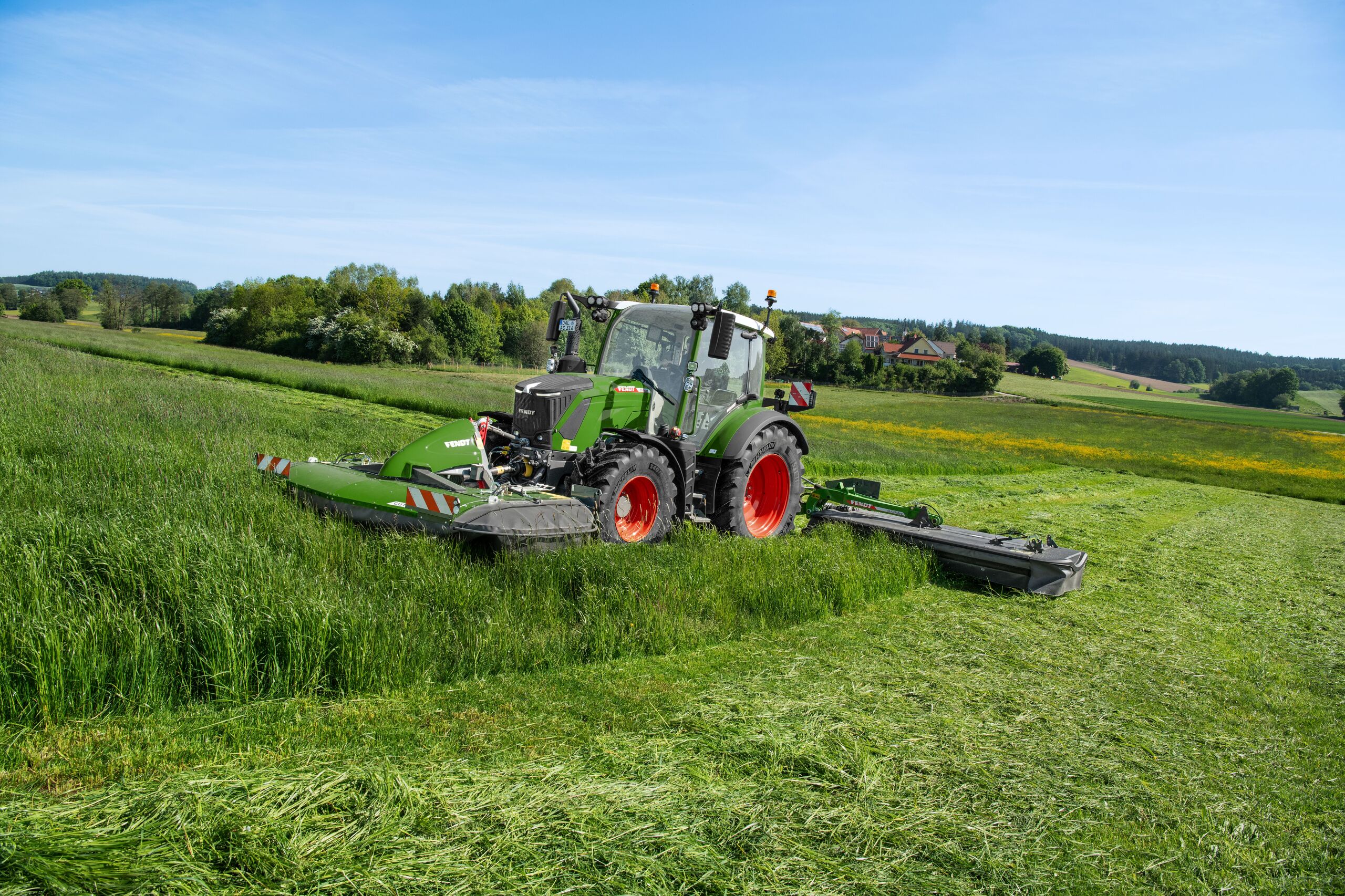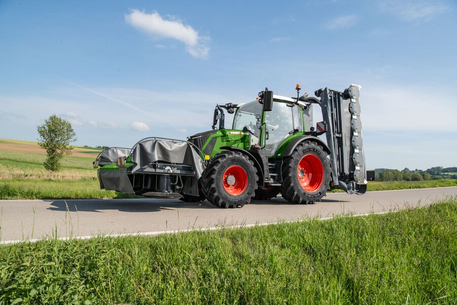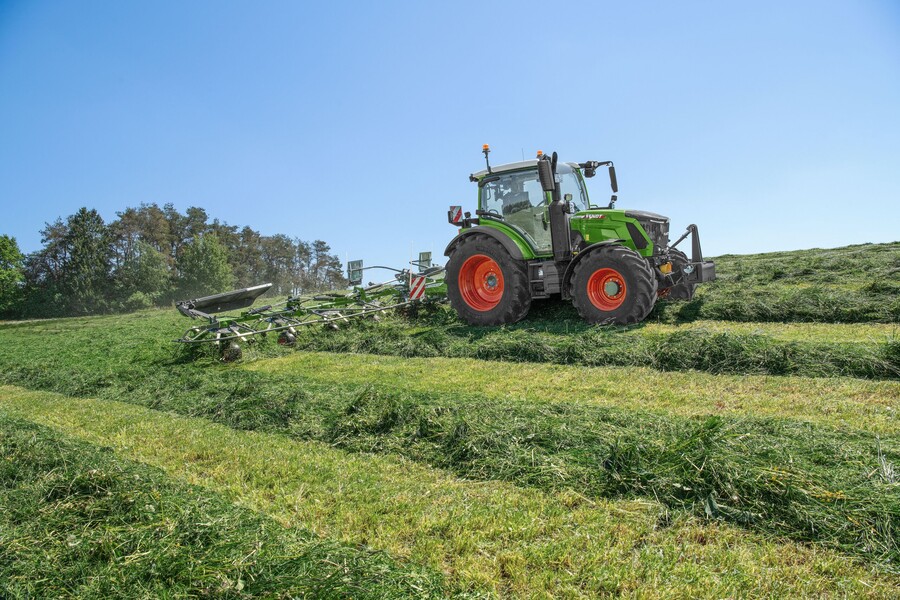 Los tractores Fendt 300 Vario siempre han sido populares en las explotaciones de pastos. Se caracterizan por su bajo peso, su maniobrabilidad y su gran altura de despeje al suelo con un alto rendimiento. Con Fendt DynamicPerformance, la serie ofrece más potencia cuando es necesario, por ejemplo, para segar con grandes combinaciones de segadoras, y, gracias a las transmisiones Vario, trabaja con suavidad sobre el suelo. El control independiente de la velocidad de la toma de fuerza y la velocidad juega aquí a su favor. Gracias a la ampliación del sistema hidráulico, el Fendt 300 Vario dispone ahora de un total de cinco válvulas, cuatro en la parte trasera y una en la delantera (4+1), de modo que también se pueden utilizar cómodamente combinaciones de segadoras con funciones adicionales, como el plegado hidráulico de la malla de seguridad. El bajo centro de gravedad y la tracción constante garantizan la seguridad en las pendientes. Incluso las hileras altas se pasan limpiamente gracias a la gran distancia de despeje al suelo, de modo que la hilera permanece intacta. La iluminación opcional de la barra de tiro GroundVision proporciona una iluminación sin deslumbramientos de la zona entre el tractor y el implemento, de modo que cuando se utiliza una rotoempacadora o un remolque cargador, el avance desde la hilera hasta el pick-up es óptimamente visible.