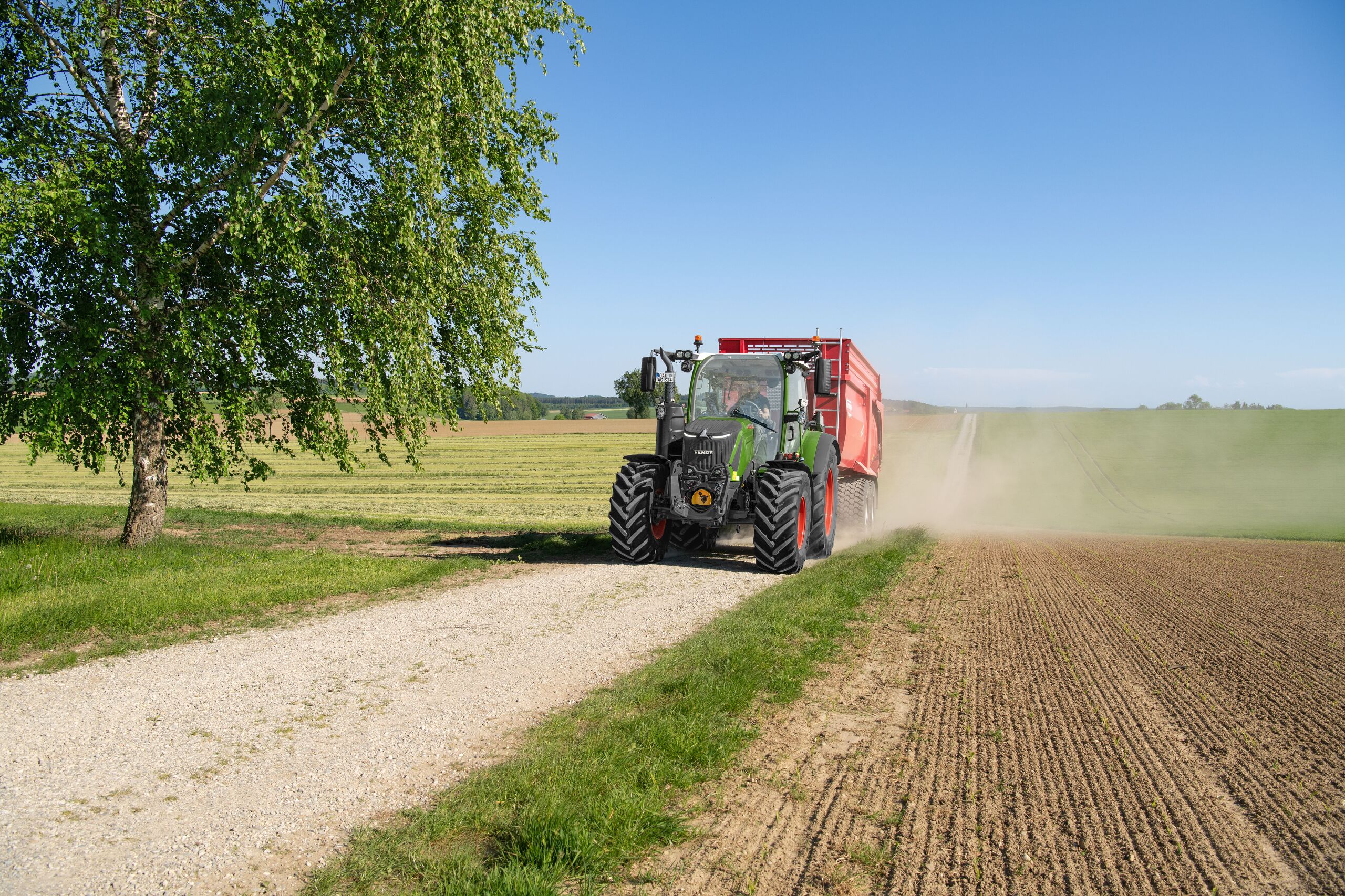 La transmisión Vario permite acelerar rápidamente de 0 a 40 km/h sin cambiar de marcha y con una tracción total y un desgaste reducido, mientras que un concepto integral de suspensión y seguridad convierte al Fendt 300 Vario en un vehículo de remolque eficiente, cómodo y seguro. Los nuevos faros LED y las luces diurnas LED mejoran notablemente la visibilidad en la oscuridad y la visibilidad en carretera durante el día. Los intermitentes dinámicos traseros indican un cambio de dirección. El nuevo asistente de frenado del remolque proporciona seguridad adicional en situaciones críticas. Si el tractor detecta que el remolque empuja con demasiada fuerza, activa automáticamente el freno neumático del remolque. Esto mantiene el remolque en línea recta y evita accidentes. A partir de otoño de 2026, se podrá encargar un freno auxiliar hidráulico opcional para una frenada sin desgaste.