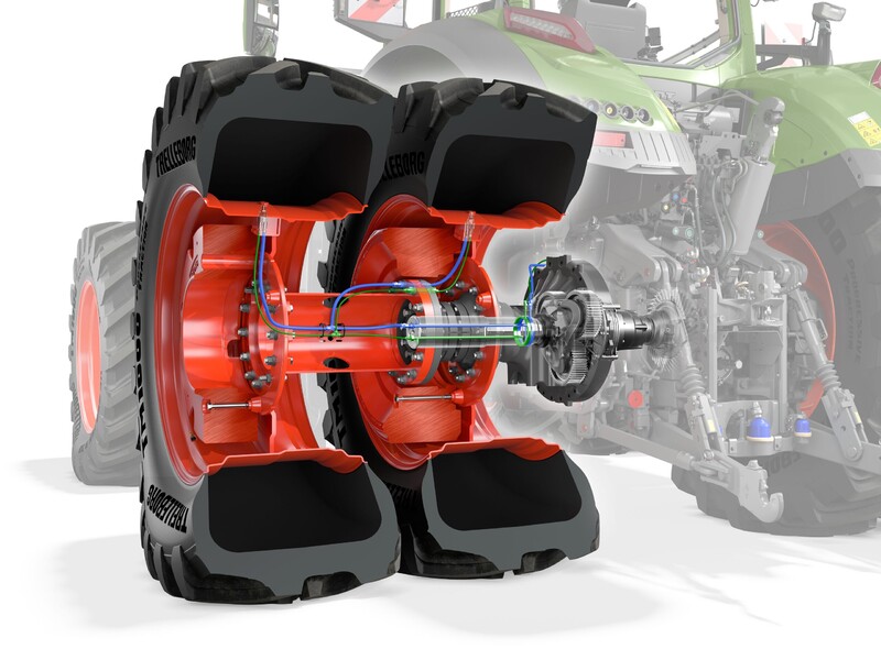 Duo-pyörännapa on kaksoisrenkaiden kytkentäjärjestelmä, joka mahdollistaa suurempien voimien siirron. Se siirtää tehon turvallisesti akseleiden kautta, toisin kuin vanteiden kautta, kuten perinteisissä ratkaisuissa. Etuakselilla käytetään hyväksi havaittua yksittäisrengasta (710/60R38). Edessä raideväliä on säädetty 2.250 mm:iin lisääntyneen kääntyvyyden vuoksi. Tämä kokonaisratkaisu on saatavilla tehtaalta, se parantaa vetotehoa ja vähentää luistoa. Samalla kone pysyy alle 3,50 m ulkoleveyden, mikä mahdollistaa hyväksynnän poikkeusluvalla. Takana on valittavissa sekä vetopuomi että K80 kuula, lisäksi voidaan käyttää perinteistä vetokoukkua perinteisten kiinnitysten kattamiseksi.