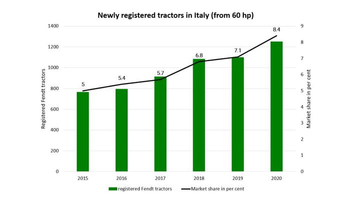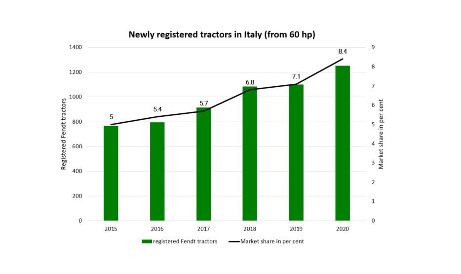 En 2020, 1 253 tracteurs neufs Fendt ont été immatriculés en Italie. Le marché des tracteurs a cependant reculé l'année dernière. Alors que 18 524 tracteurs neufs étaient immatriculés sur le marché en 2019, 18 005 nouvelles immatriculations ont été enregistrées en 2020, soit 519 tracteurs de moins. Pour les tracteurs de 60 ch ou plus, Fendt a atteint une part de marché de 8,4% en 2020. En 2015, cette dernière était de 4,9%. Fendt a ainsi augmenté sa part de marché de 3,5% en cinq ans. L'augmentation régulière des parts de marché a été influencée positivement par le renforcement du réseau Fendt sur l'ensemble de la gamme Fendt Full Line en Italie.