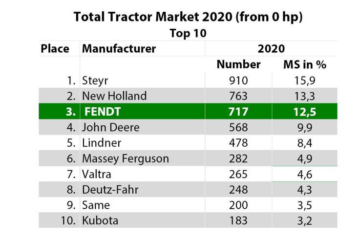 Fendt a atteint en 2020 une part de marché de 12,5% en Autriche pour les tracteurs dès 0 ch, incluant les tracteurs spécialisés, soit 717 tracteurs neufs Fendt immatriculés au total. Cette part de marché Fendt a ainsi augmenté de 2,3%. En 2019, cette dernière était de 10,2% avec 541 tracteurs Fendt immatriculés. Au total, 5 716 tracteurs ont été immatriculés sur le marché autrichien en 2020, soit 424 de plus que l'année précédente.