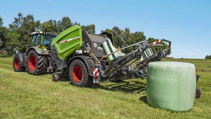 La Fendt Rotana 160 V Combi se démarque par chacun de ses aspects. Le faible angle d'inclinaison de la chambre à balles assure une excellente stabilité, en particulier dans les pentes. De plus, un angle d'inclinaison réduit assure également un débit de fourrage et un rendement optimaux. La grande vitesse de travail est le second atout. Grâce à son système d'enrubannage réglable entièrement automatique, la machine mesure le diamètre de la balle durant le liage filet et calcule en temps réel le nombre optimal de couches de film plastique.