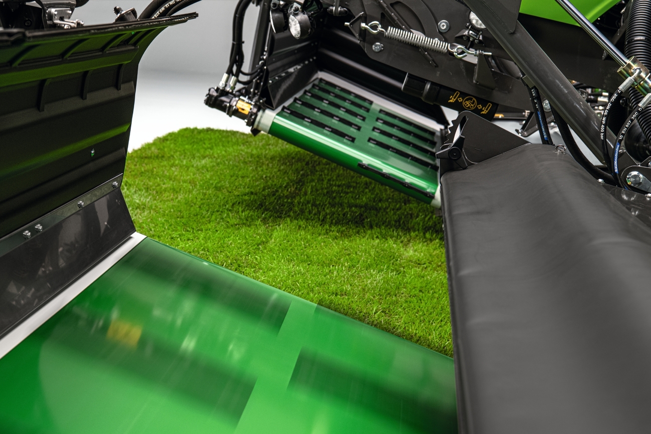 The grouper belts are now at a flatter angle to the mower unit. Due to the new working position, they are fed more evenly across the entire belt width. This optimises the forage transport. Newly developed two-part plastic bars provide aggressive forage collection, increasing overall performance. An edge protector on the rear wall facilitates cleaning, avoids forage accumulation on the belt and also ensures even feeding. In addition, a frame prevents dirt from entering the space in between, and wipers on the outer sides further facilitate cleaning.