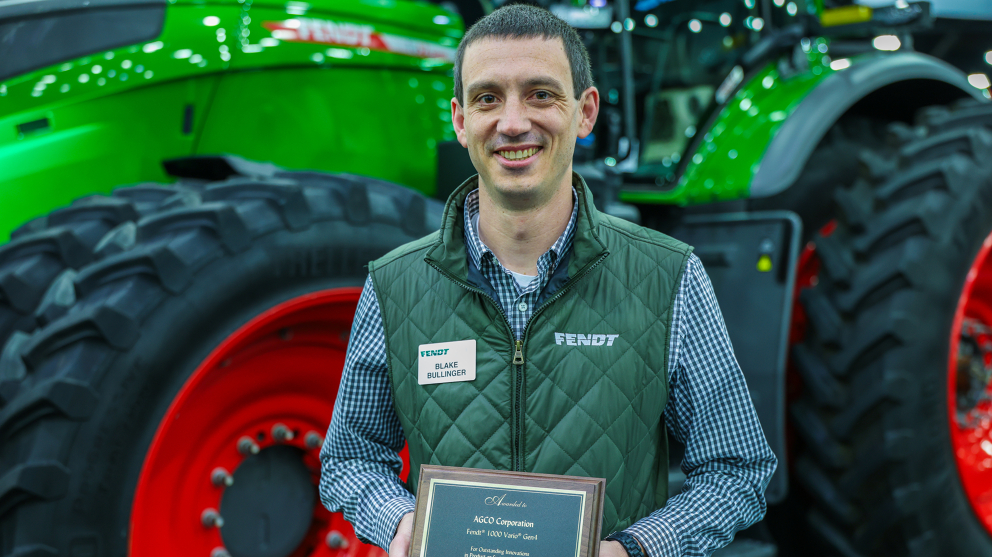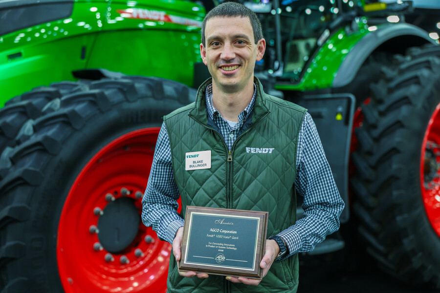 Arthur Santos (Fendt NA) and Blake Bullinger (Fendt NA) with the AE50 2026 Awards for the Fendt 800 and 1000 Vario at the National Farm Machinery Show