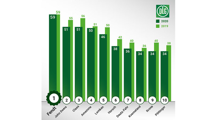Il DLG (Società Agricola Tedesca) descrive i risultati del sondaggio per il 2020 come segue: “Nel settore della tecnologia agricola, Fendt rimane alla guida, con punteggi addirittura superiori, mentre gli altri contendenti perdono terreno, in alcuni casi significativamente.”