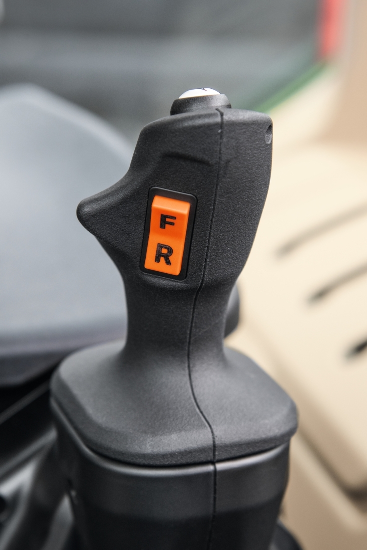 Il joystick viene montato su un nuovo bracciolo regolabile a sinistra del sedile del conducente, integrando così il noto bracciolo FendtONE a destra. Dispone inoltre di un bilanciere per cambiare la direzione di marcia analogamente a come farebbe l'interruttore del piantone dello sterzo, inclusa la funzione Stop & Go e un pulsante per attivare il sistema di guida automatica Fendt Guide. Sul joystick di sterzo si trova un pulsante di attivazione della guida automatica. In questo modo viene liberato un pulsante sul bracciolo destro che può essere assegnato liberamente ad altre funzioni. Grazie al joystick di sterzo, le/i conducenti possono gestire l’intero angolo di sterzata usando solamente il polso. Ciò consente una posizione seduta eretta in qualsiasi momento. Il lavoro così ergonomico allenta la tensione nella zona delle spalle e del collo.