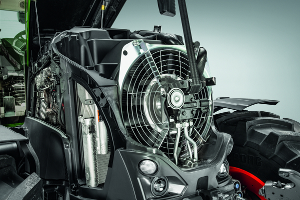 - Door de extreem smalle compacte ventilator is een smalle motorkap mogelijk en wordt superieure overzichtelijkheid met uitstekende wendbaarheid gecombineerd: draaicirkel van slechts 10,0 m bij 540/65 R30-banden, zelfs bij 600/70 R30-banden is de draaicirkel slechts 11,8 m – superieur in de 300 pk-klasse!