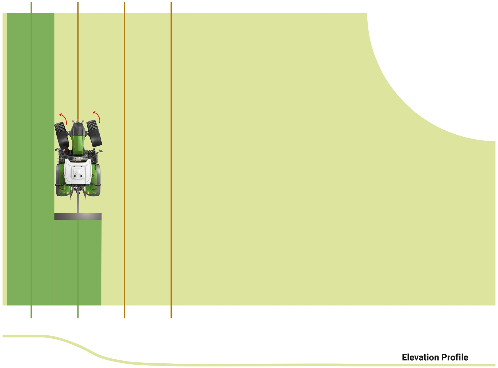 Podczas prac na zboczu ciągnione narzędzia doczepiane mogą mimo systemu prowadzenia pojazdu być znoszone pod własnym ciężarem i powodować nakładanie się powierzchni obróbki. Kierowcy muszą wówczas ręcznie ingerować w system prowadzenia pojazdu i korygować kurs. Przykładowo muszą przesuwać linie toru, aby utrzymać narzędzie doczepiane w jak najlepszej pozycji do poprzedniego toru. Nowa opcja Fendt Implement Slope Compensation umożliwia kierowcy wymuszenie zadanego toru. W tym celu ustawia on pewną wartość korekty na każdy stopień nachylenia zbocza. Kurs ciągnika korygowany jest wówczas automatycznie zależnie od bieżącego nachylenia zbocza, aby narzędzie doczepiane jak najlepiej pracowało na torze jazdy. Ma to korzystny wpływ na jakość wykonywanych prac uprawy roli i wysiewu. Komfort pracy jest o tyle lepszy, że nie są wymagane ręczne zmiany kierunku. W przypadku tego rozwiązania nie jest potrzebny drugi odbiornik w narzędziu doczepianym.