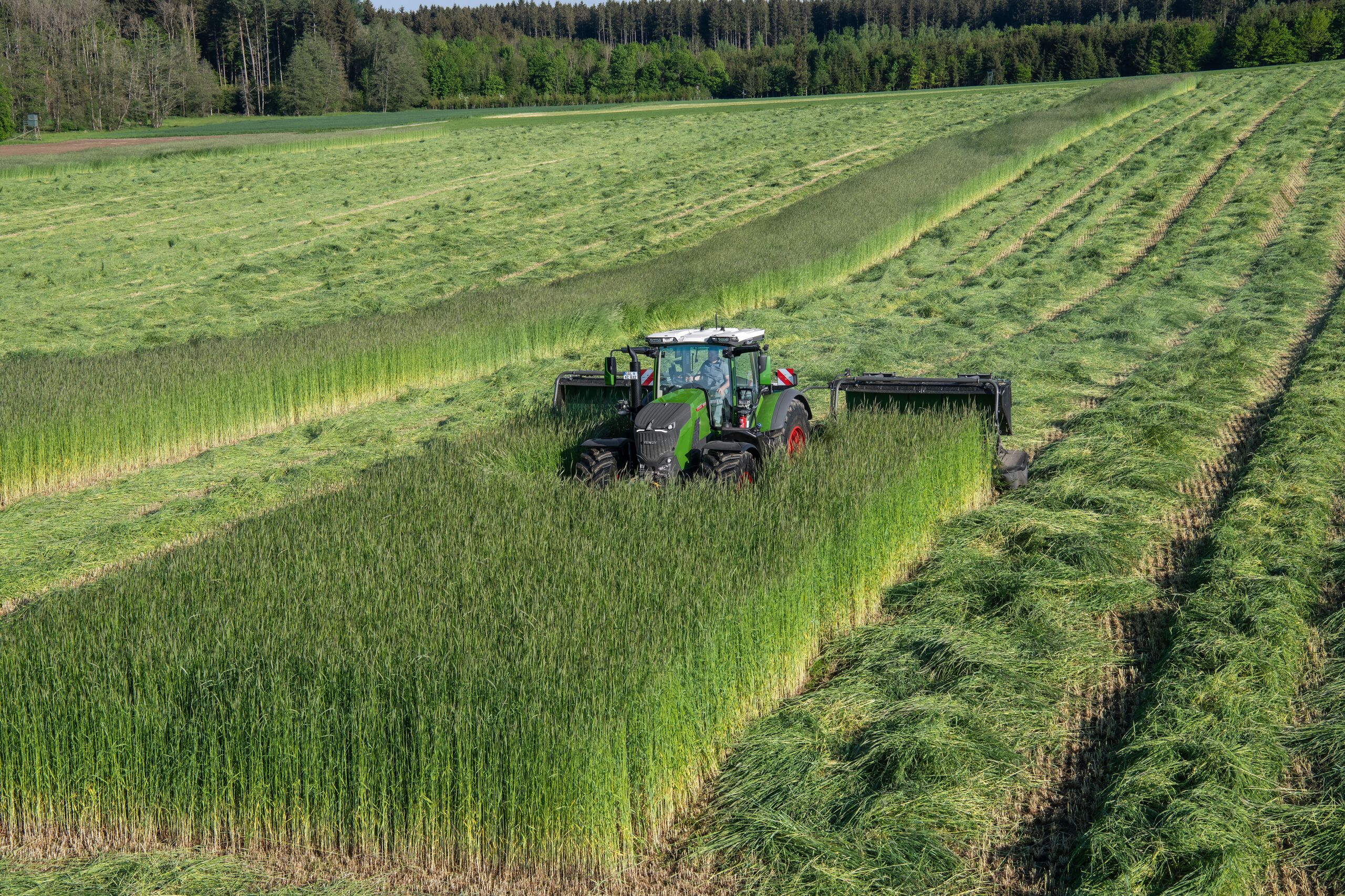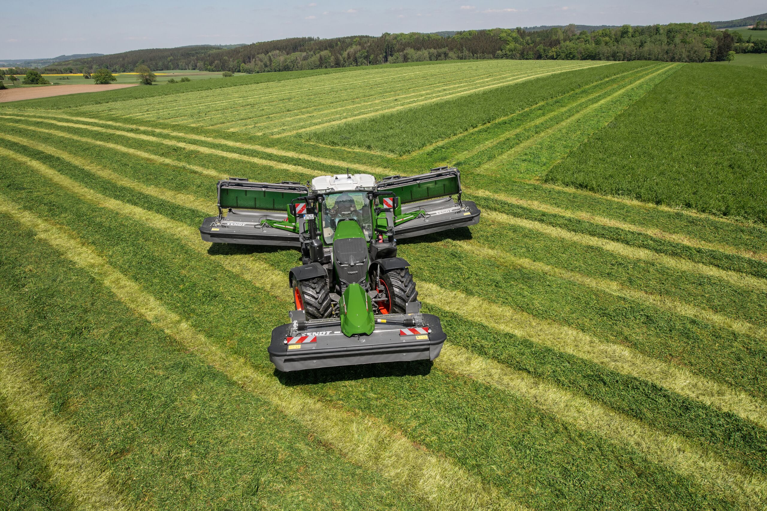 Na dużych obszarach użytków zielonych rolnicy i przedsiębiorstwa świadczące usługi dla rolnictwa potrzebują wydajnej techniki o wysokiej ładowności, która chroni glebę. W ten sposób efektywnie wykorzystują odpowiednie okna czasowe, nawet w niepewnych warunkach pogodowych. Złożone kombinacje kosiarek, takie jak kosiarka przednia Fendt Slicer i kosiarka tylna Fendt Slicer 1010 RCB PRO z przenośnikiem, wymagają wystarczającego ciężaru użytkowego, aby móc legalnie transportować kosiarki. Niska masa własna maszyny, opcjonalnie chłodzony przedni WOM, układ regulacji ciśnienia w oponach Fendt VarioGrip oraz pełny zakres systemu FendtONE onboard wyróżniają Fendt 800 Vario w zastosowaniach na użytkach zielonych. Podczas gdy niezależny napęd na cztery koła Fendt VarioDrive chroni darń i zapobiega zanieczyszczeniu paszy, Fendt VarioGrip zmniejsza nacisk na glebę. Dodatkowo dostępna jest dla Fendt 800 Vario opcjonalna regulacja odciążania przedniego podnośnika. Dla uzyskania optymalnego obrazu cięcia listwa tnąca utrzymuje stały nacisk na podłoże – niezależnie od ukształtowania terenu. Opcje takie jak oświetlenie belki zaczepowej GroundVision lub przednia szyba LSG zwiększają bezpieczeństwo pracy, szczególnie w trudnych warunkach oświetleniowych.