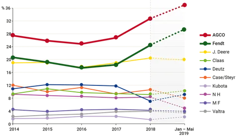"Os dados oficiais da Direção Geral de Viação Alemã sobre matrículas de tratores na Alemanha em 2019 parecem, à primeira vista, ser bastante bons. De janeiro a maio foram matriculados ao todo 12.038 tratores novos. Isto representa um aumento de 21,7% face ao ano anterior", afirmou Paffen e chamou a atenção para o facto de ainda ser necessário ter em conta os efeitos extraordinários das matrículas antecipadas no final de 2017, que por sua vez contribuíram para um fraco número de novas matrículas no início de 2018. Não obstante, o mercado de tratores alemão encontra-se atualmente a um nível relativamente consistente. No mercado geral de tratores, a Fendt registou nos primeiros cinco meses quotas de mercado de 23,9% para vendas de tratores a partir de zero HP, de 29,4% para tratores a partir de 51 HP e de 42,6% para tratores a partir de 201 HP, o que equivale em qualquer dos casos à primeira posição. "O nosso objetivo é, até ao final do ano, melhorar a posição de mercado já muito boa que a Fendt ocupa na Alemanha. Agradecemos a confiança que os nossos clientes depositam na nossa marca e a boa cooperação com os parceiros comerciais independentes da Fendt", realçou.