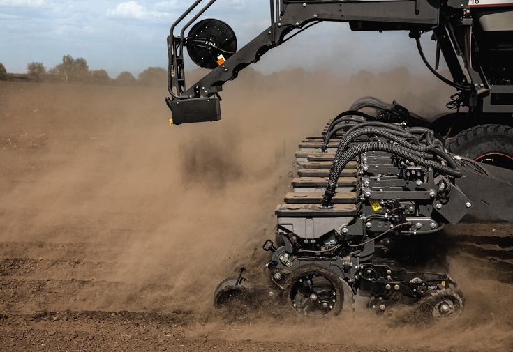 Todas as funções de preparo de trabalho e transporte são projetadas para a máxima eficiência. A plantadeira de precisão funciona com o toque de um botão. Ao mesmo tempo, o sistema de enchimento de pneu é ativado e ajusta a pressão interna do pneu. Não há necessidade de seguir uma sequência definida de etapas de trabalho no processo de dobra - a máquina faz tudo automaticamente.