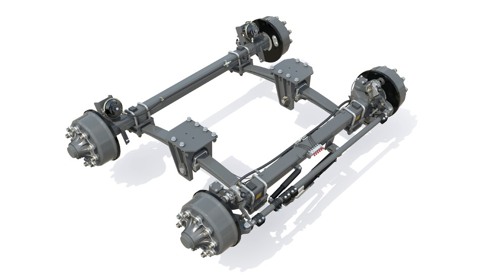 Todas as enfardadoras de fardos retangulares com eixo tandem para o ano 2023 serão equipadas com uma nova suspensão aprimorada e eixo de direção passivo de série. O projeto aumenta a manobrabilidade e evita danos ao solo e à relva. Além disso, todos os modelos serão equipados com pneus maiores de série em comparação com a geração anterior. Mesmo com a maior dimensão de pneu possível 620/50R-22.5, a largura externa das prensas permanece abaixo de 3 m. A barra de lubrificação permite a lubrificação de uma só vez e reduz os tempos de manutenção.