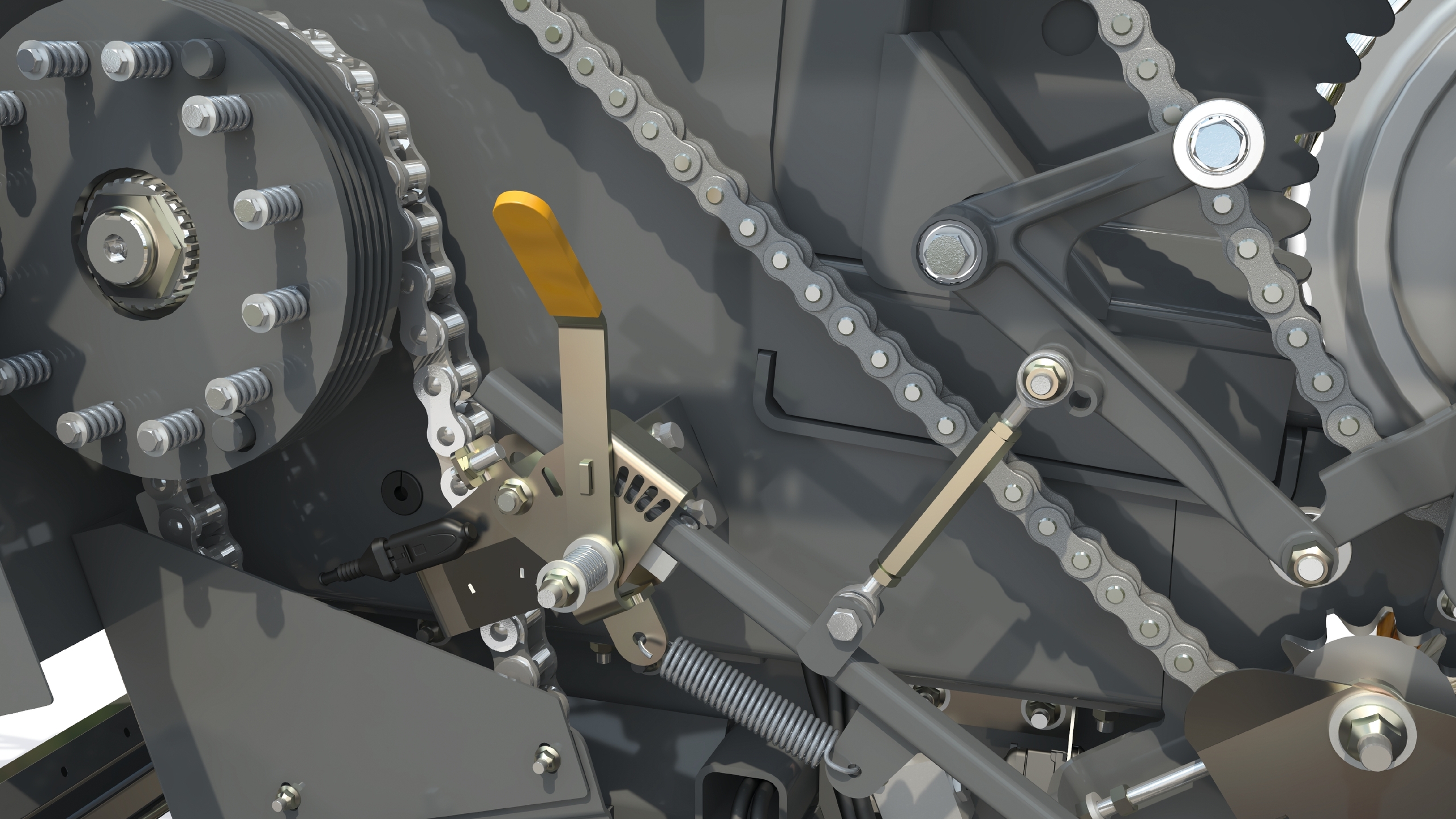 Para melhorar ainda mais a longevidade das prensas, o canal de prensa e a câmara de pré-compressão foram reformulados. Por exemplo, a tensão da mola da aba do sensor na câmara de pré-compressão pode agora ser ajustada de forma rápida e fácil às condições existentes por meio de uma alavanca, de modo que os fardos possam ser sempre compactados à perfeição.