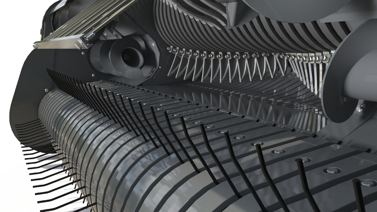 Uma fileira adicional de dentes aumenta o desempenho do pick-up. A partir do ano de 2023, as cinco fileiras de dentes deixarão a colheita ainda mais fácil e a velocidade de trabalho poderá ser aumentada. Além disso, os novos raspadores de plástico são agora padrão no pick-up. A superfície lisa melhora a qualidade dos fardos e evita a entrada de partículas de sujeira. Além disso, a superfície lisa dos raspadores de plástico reduz o atrito. Isso garante um fluxo de colheita mais limpo. O polipropileno resistente dos raspadores aumenta significativamente sua vida útil e, ao mesmo tempo, reduz o ruído. O peso reduzido dos raspadores e o posicionamento inteligente simplificam ainda mais a manutenção.