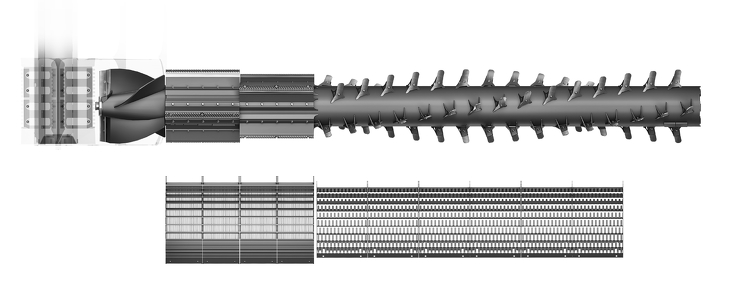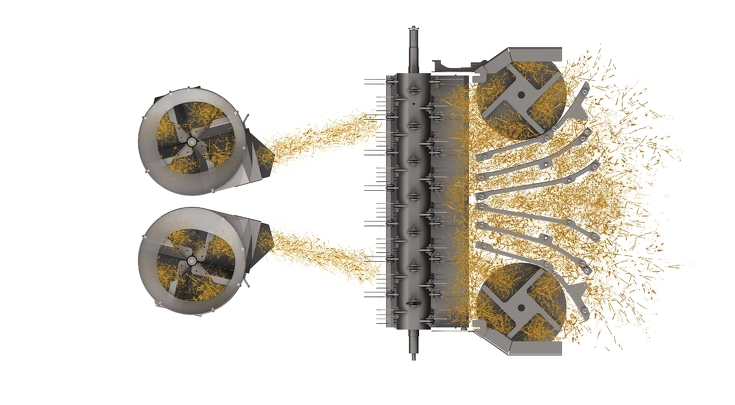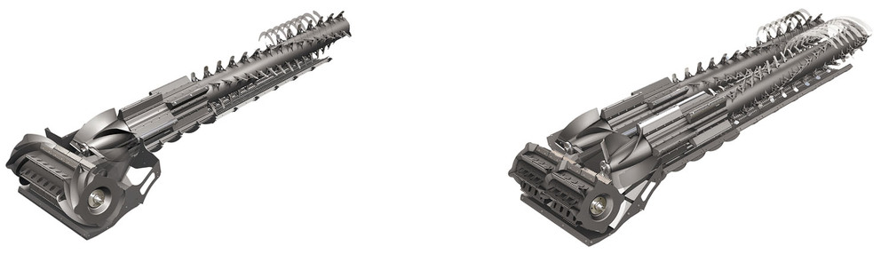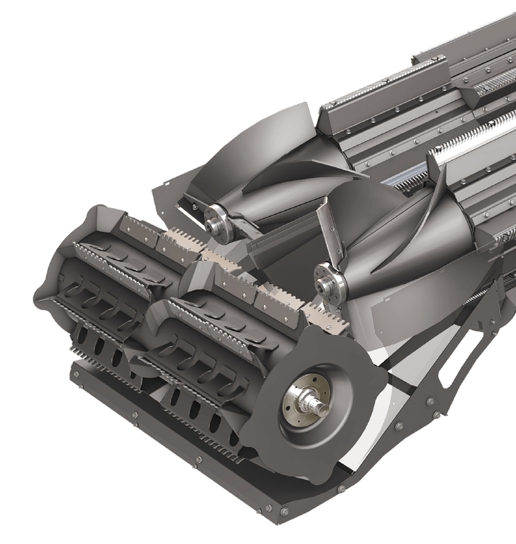 Все компоненты роторов, такие как бичи и пальцы ротора, установлены в четыре ряда в виде спирали. Передняя часть роторов содержит 4 бича, установленных в продольном направлении. Эти бичи выбивают зерно из колосьев. Под роторами расположены подбарабанья, которые могут иметь различную конструкцию, предназначенную для получения наилучших результатов в различных типах работ. Их можно легко и просто снять с боков и установить нужные подбарабанья в зависимости от типа операции. Расстояние между подбарабаньями регулируется гидроприводом, его максимальное значение составляет 35 мм. Пальцы ротора отклонены на 20° назад, благодаря чему поток растительной массы разделяется между витками спирали, которая надежно захватывает массу и деликатно оборачивает ее вокруг ротора. Благодаря этому удается избежать пиковых нагрузок на ротор. Кроме того, на конструкции отсутствуют грани, за которые растительная масса могла бы цепляться.