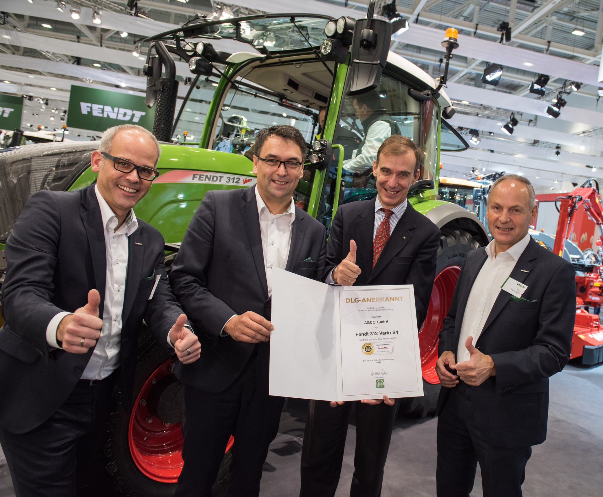 Den tyska lantbruksorganisationen (DLG) har genomfört ett omfattande övergripande test och bruksvärdestest på ovannämnda Fendt-traktorer enligt godkända bedömningskriterier grundade på erkänd praxis. Modellerna Fendt 514 Vario och Fendt 312 Vario uppvisade ett utmärkt bruksvärde i DLG PowerMix-testet, och vid det övergripande testet av Fendt 828 Vario uppmärksammades även traktorernas produktkvalitet och driftsäkerhet. Ordföranden för DLG Carl-Albrecht Bartmer besökte Fendts monter vid Agritechnica och delade på ett högtidligt sätt ut diplomen. ”Vi är stolta över resultaten och mycket glada för utmärkelserna. Vi arbetar ständigt med att vidareutveckla våra traktorer, så att våra kunder och lantbrukare alltid är redo för framtiden”, säger glatt Roland Schmidt, som är vice ordförande för Fendt Marketing. På Agritechnica visar Fendt bland de många produktnyheterna även upp modellserien Fendt 300 Vario i utförandet ProfiPlus med spårhållningen VarioGuide.