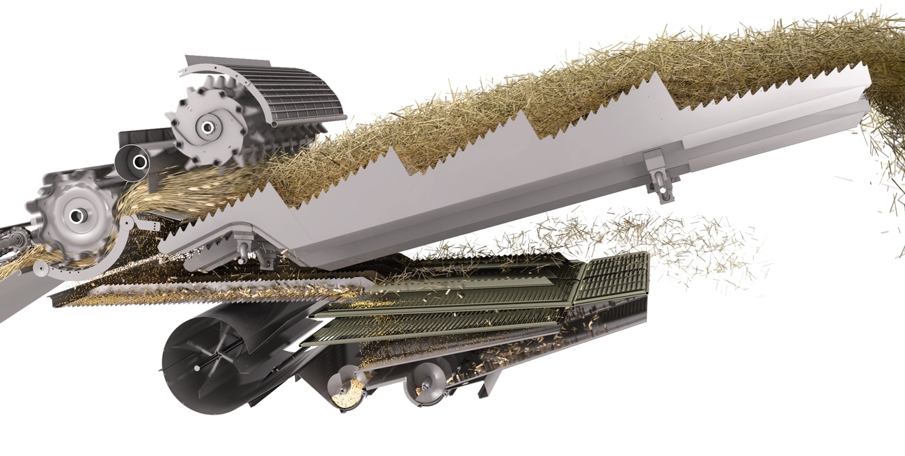 Grödans kvalitet är avgörande för din vinst. Under utvecklingen av skakarenhet låg fokus därför på användningen av såll med hög kapacitet för att skörda den renaste grödan. Specialytan på sållen med hög kapacitet (HC-såll) ger optimerat vindflöde och den högsta rengöringsprestandan. För att säkerställa att grödan fördelas jämnt på sållen även i sluttningar fäster man höga skiljeväggar på det övre sållet. Retursystemet transporterar tillbaka material som inte har tröskats optimalt till tröskningscylindern. Detta görs mycket försiktigt och enhetligt eftersom en inmatningsskruv ovanför cylindern fördelar materialet över hela tröskningsenhetens bredd.