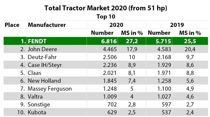 Fendt досяг нового рекорду в класі 51 к.с. і вище. Тут марка досягла частки ринку в 27,2%, що на 1,7% вище торішнього показника в 25,5%. Відрив від другого місця ще більше збільшився на 9,3%.