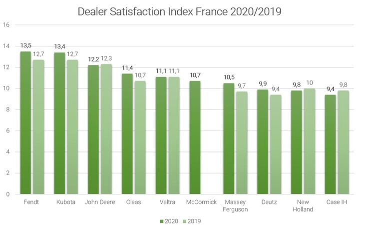 Дані French Dealer Satisfaction Barometer 2020 (французький барометр задоволеності дилерів 2020 року) були опубліковані одночасно з частками ринку. В цьому році компанія Fendt знову посіла перше місце. Володіючи загальною сумою в 13,5 балів, це ставить Fendt на 0,8% другого місця, а також є поліпшення на 0,8% в порівнянні з попереднім роком. В ході опитування французькі дилери оцінили виробників тракторів у 14 категоріях і могли присудити до 20 балів.