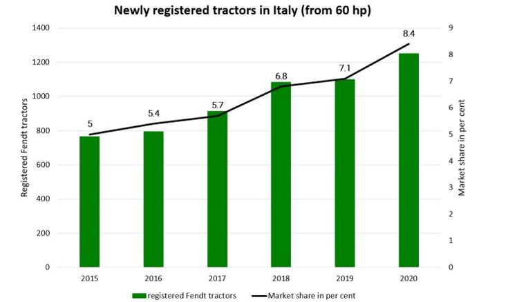 Для тракторів потужністю 60 к.с. і більше, Fendt досягла частки ринку в 8,4% у 2020 р. В 2015 р. частка ринку склала 4,9%. Таким чином, Fendt збільшила свою частку ринку на 3,5% протягом п'яти років. Стійке зростання також було позитивно обумовлено зміцненням мережі продажів Fendt для всієї програми Fendt Full Line в Італії.
