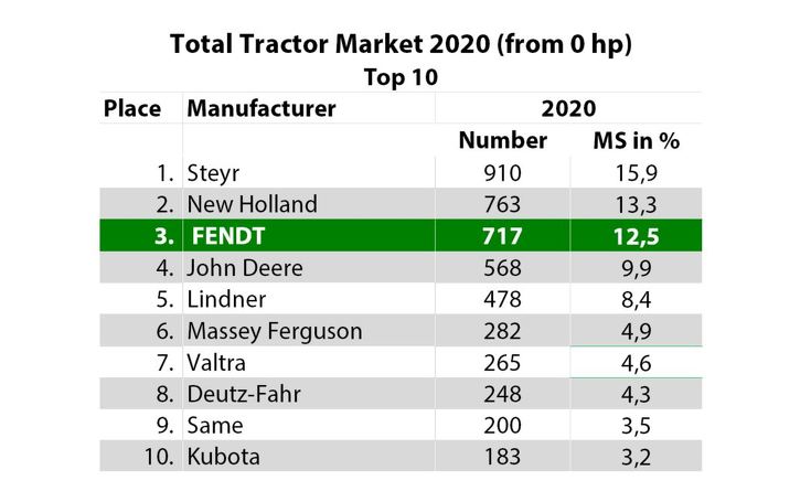 У 2020 році компанія Fendt досягла частки ринку в 12,5% на австрійському ринку тракторів для машин потужністю 0 к.с. і вище, включаючи спеціальні трактори — в цілому 717 нових зареєстрованих трактора Fendt.