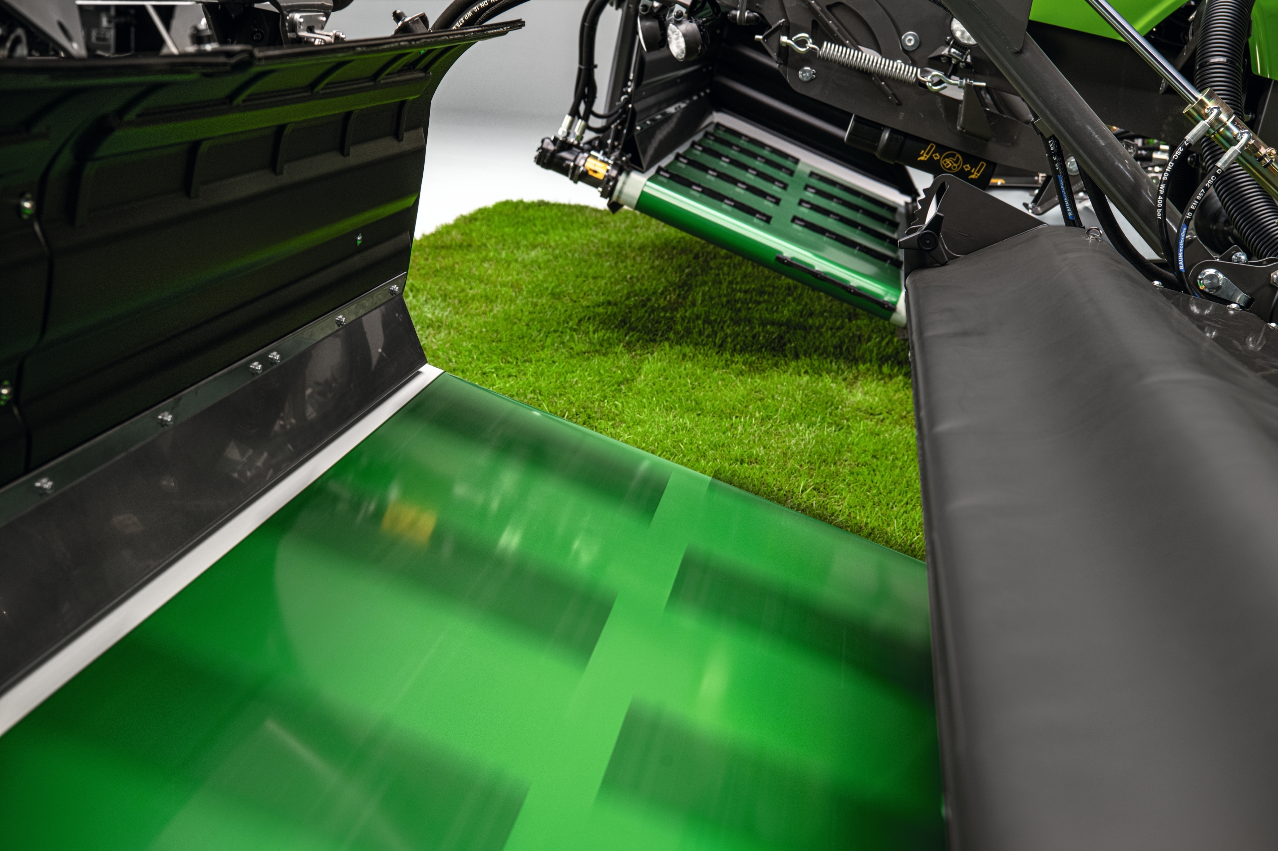 The grouper belts are now at a flatter angle to the mower unit. Due to the new working position, they are fed more evenly across the entire belt width. This optimises the forage transport. Newly developed two-part plastic bars provide aggressive forage collection, increasing overall performance. An edge protector on the rear wall facilitates cleaning, avoids forage accumulation on the belt and also ensures even feeding. In addition, a frame prevents dirt from entering the space in between, and wipers on the outer sides further facilitate cleaning.