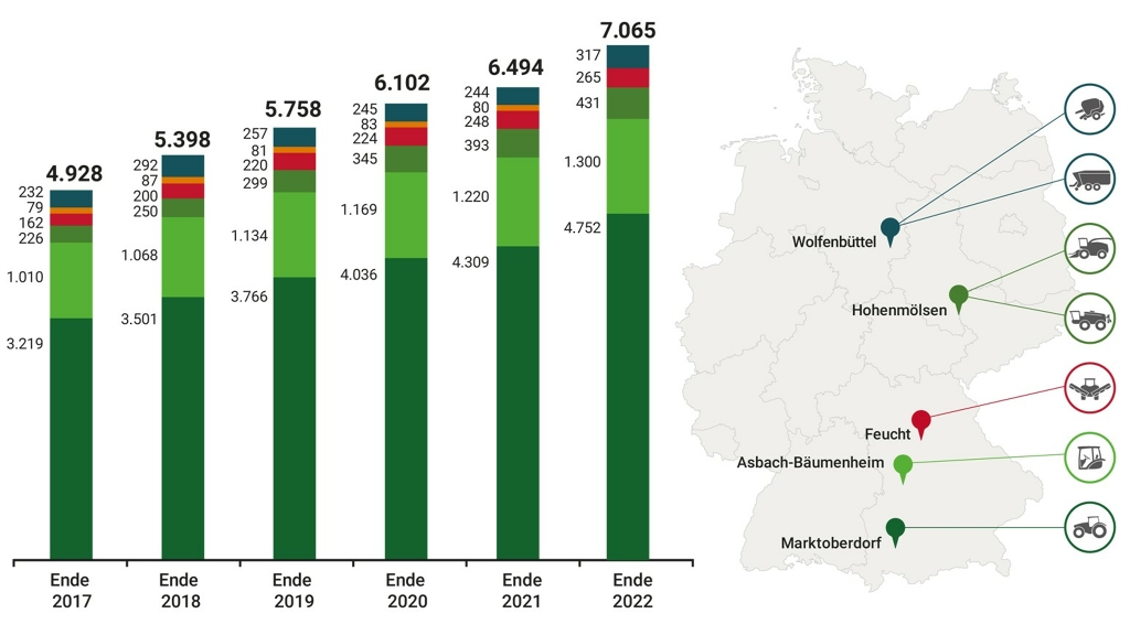 Explanation of the illustration: The green number indicates the number of Fendt tractors produced. The percentage below represents the export share.