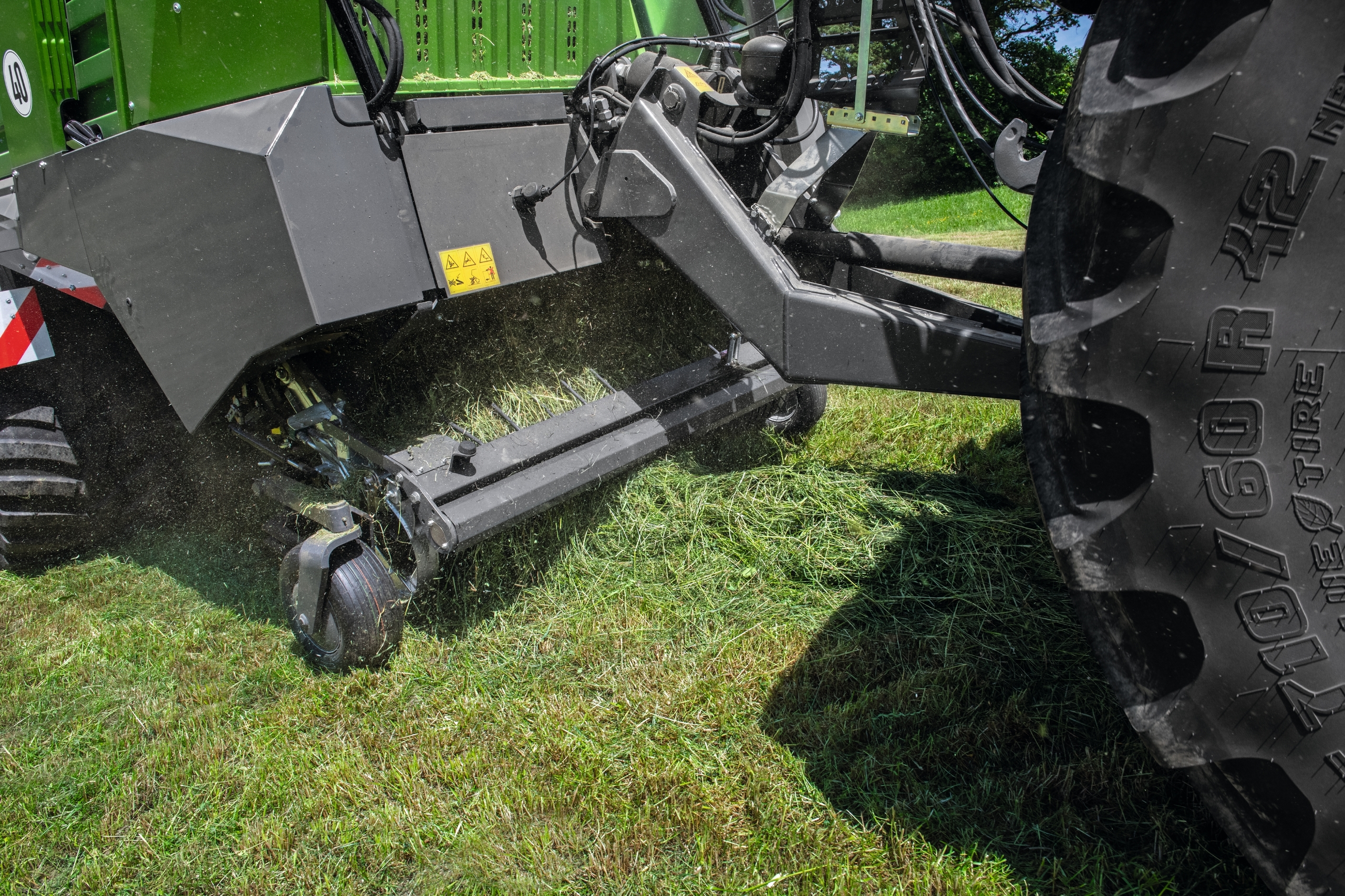 With a swinging pick-up working width of 2 meters (DIN-standard spec), the Fendt Tigo suits large farms that rely on self-mechanisation. For a large throughput, the pick-up of the Fendt Tigo VR comes with 7 rows of tines. The larger width means more material can be picked up and makes it easier to drive into the swath. The wide pick-up ensures a high impact even when cornering. The hydraulic drive also promises greater flexibility, steplessly adapting the speed of the pick-up from 70 rpm to 150 rpm depending on the crop and conditions.
